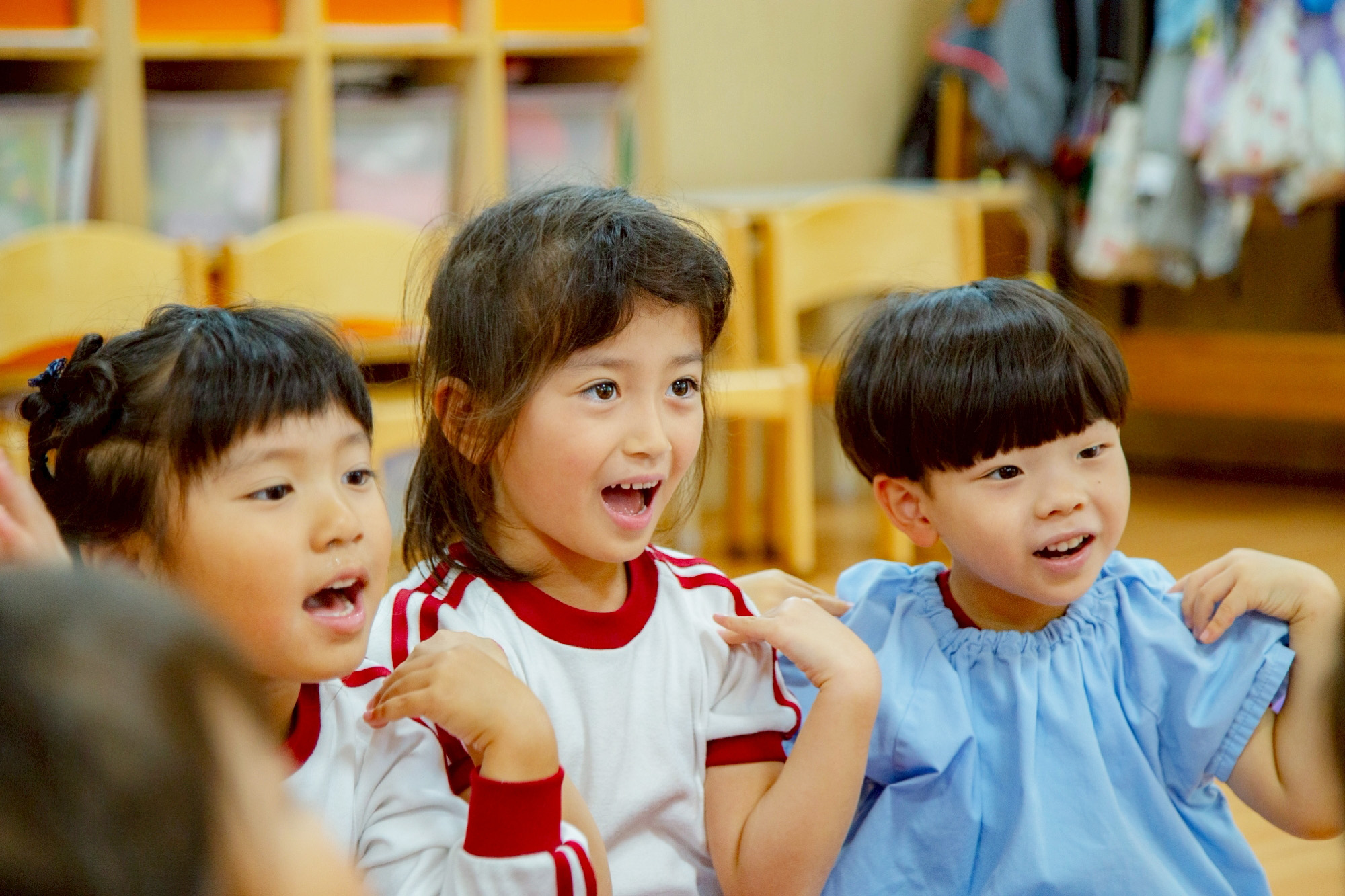 - 年少の頃から、ロッカーや靴箱など、身の回りのものに名札をつけ、自身の名前を読む機会を設け、「これは◯◯くんのだよ」「これは○○ちゃんのだ!」と教え合うような日常のやりとりの中で、子どもたちは自分や友だちの名前に親しみを持ち始めます。